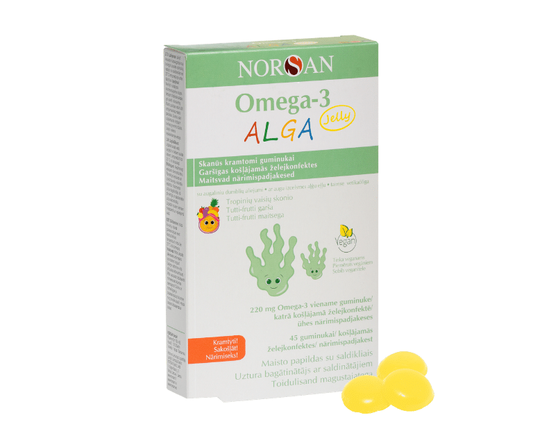 NORSAN Omega-3 ALGA Jelly ir garšīgas, košļājamas želejkonfektes ar aļģu eļļu – ideāli piemērotas bērniem un pieaugušajiem, kuri vēlas uzņemt omega-3 bez kapsulām vai eļļas garšas. Produkts nesatur pievienotu cukuru un ir 100% vegānisks. Piemērots vegāniem un veģetāriešiem. Katras želejas sastāvā ir neaizstājamās jūras omega-3 taukskābes: