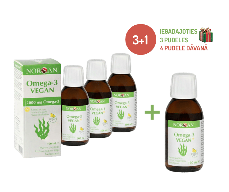 NORSAN Omega-3 Vegan (100 ml) ir unikāla, augstas kvalitātes vegāniska aļģu eļļa, kas apvieno mikroaļģu eļļu ar īpaši neapstrādātu bioloģisku olīveļļu. Dienas deva (5 ml jeb 1 tējkarote) nodrošina 2000 mg omega-3 taukskābju, tostarp DHS (dokozaheksaēnskābi) un EPS (eikozapentaēnskābi). Piemērots vegāniem, veģetāriešiem un grūtniecēm.